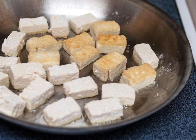 7. At first, the tofu will stick to the pan (unless you're using a nonstick skillet). Wait until the tofu releases from the pan before browning the next side; the underside of the tofu should be golden-brown.