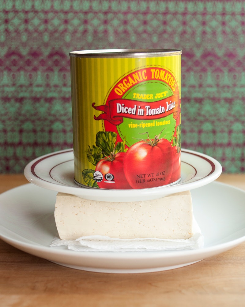 1. Remove the weight and drain off the excess liquid. Pat the tofu dry. Slice the tofu into cubes, thick rectangles, or sticks, depending on how you plan to use the tofu.
