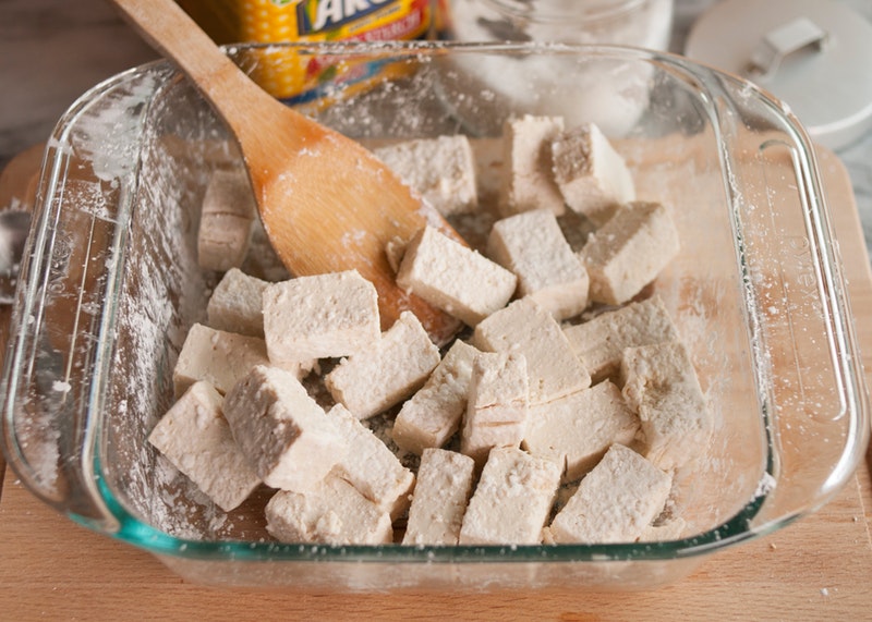 4. Toss tofu in potato starch mixture, until well coated on all sides.