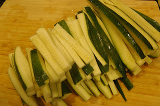 Meanwhile, prepare zucchini into noodles - thick by slicing the zucchini into desired size of strips or nice and thin (more like actual noodles) with a julienne slicer! This time I did thick, but I think we prefer the thing ones with the julienne slicer.